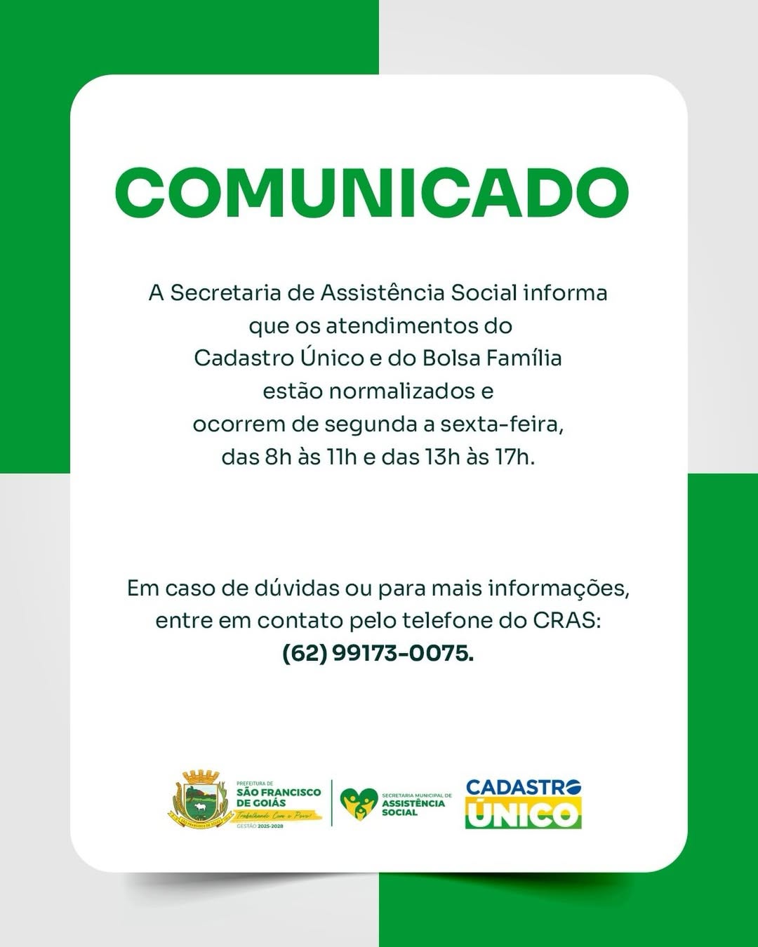 📞 Em caso de dúvidas, entre em contato com o CRAS pelo telefone: (62) 99173-0075.